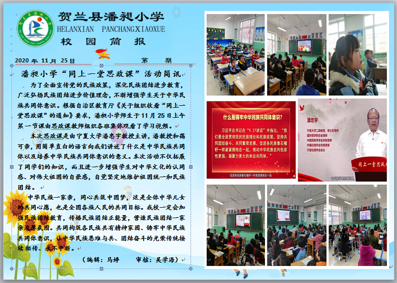为了全面宣传党的民族政策,深化民族团结进步教育,广泛弘扬民族团结进步价值理念,不断增强学生关于中华民族共同体意识。根据自治区教育厅《关于组织收看“同上一堂思政课”的通知》要求,潘昶小学师生于11月25日上午第一节课由思政课教师组织各班集体观看了学习视频。