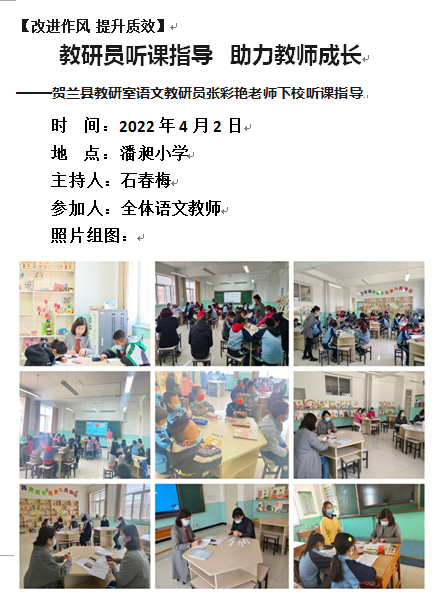 为促进教师专业素养的提升,全面提升我校课堂教学质量,4月2日上午,贺兰县教研室语文教研员张彩艳老师来到我校,走进课堂,亲临教学一线为老师们做指导。
